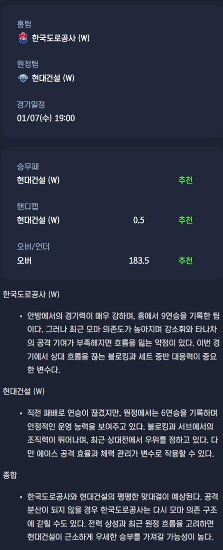 2026년 01월 07일 한국도로공사 하이패스 배구단 현대건설 힐스테이트 배구단 / V리그 여자배구분석