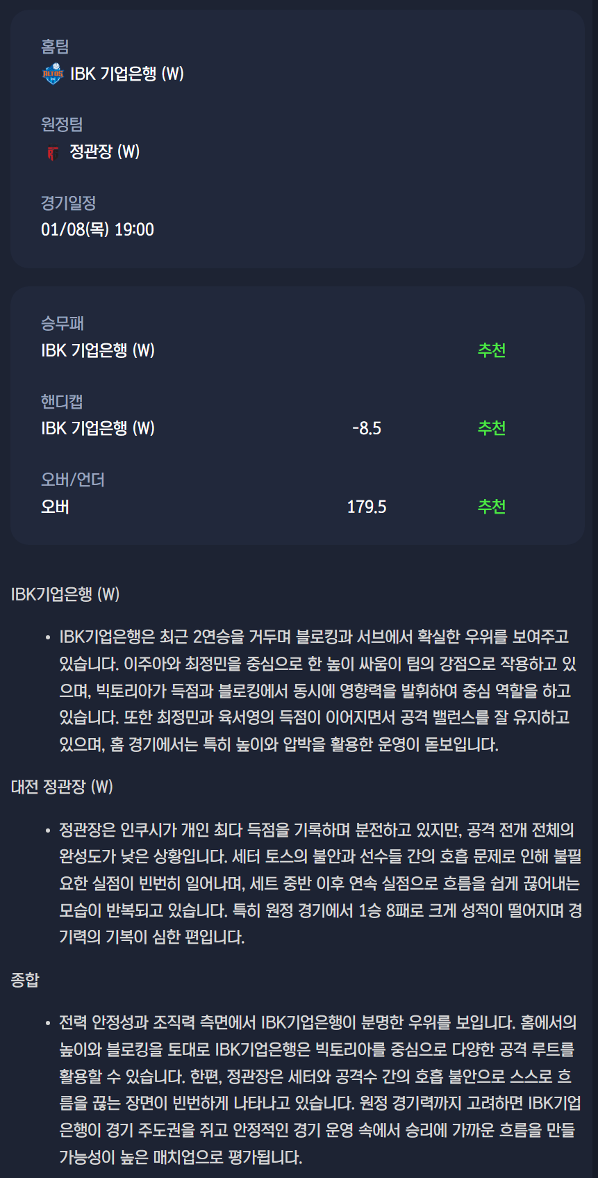 2026년 01월 08일 IBK기업은행 알토스 배구단 정관장 레드스파크스 / V리그 여자배구분석
