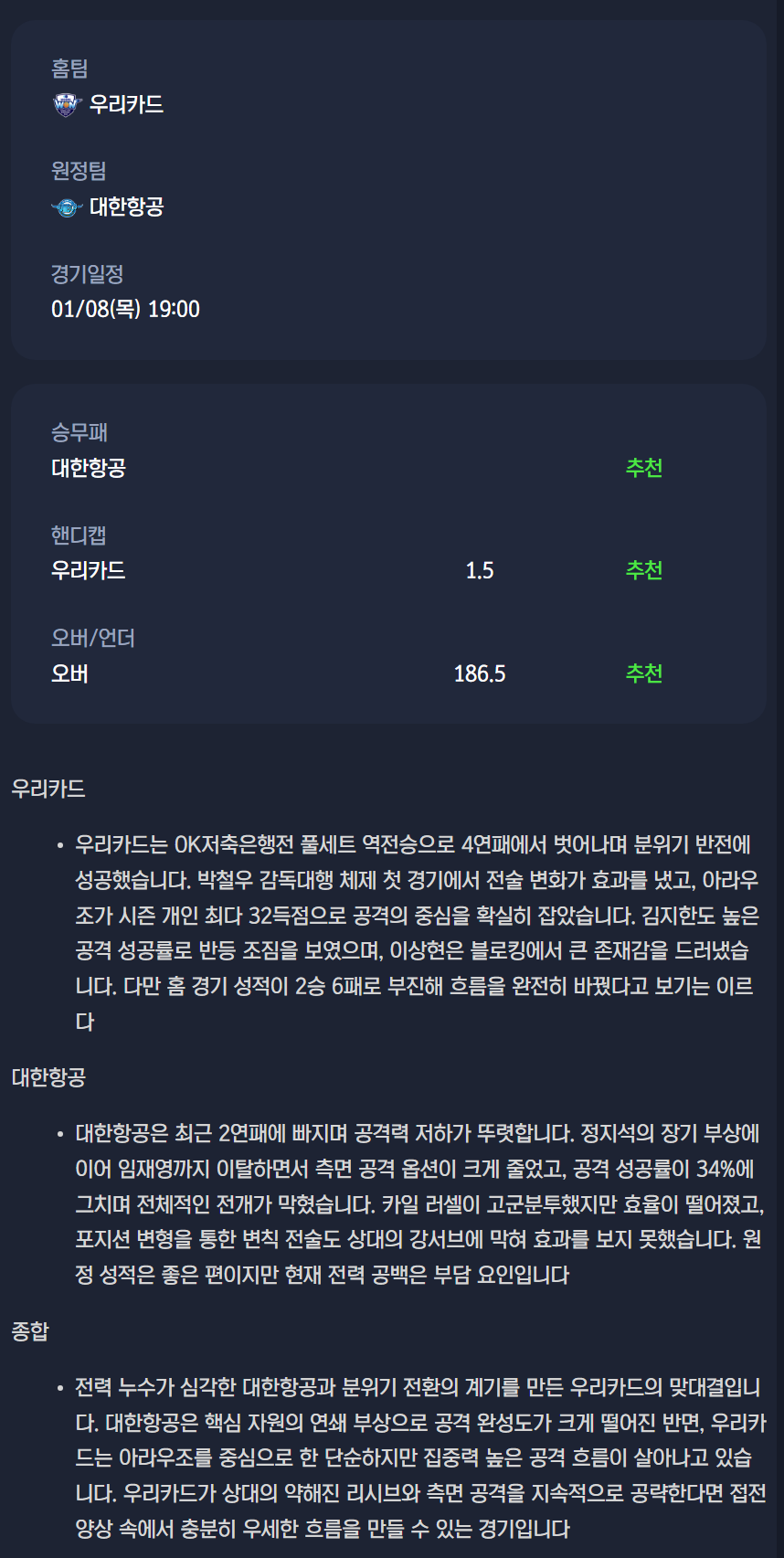 2026년 01월 08일 우리카드 우리WON 배구단 대한항공 점보스 배구단 / V리그 남자배구분석