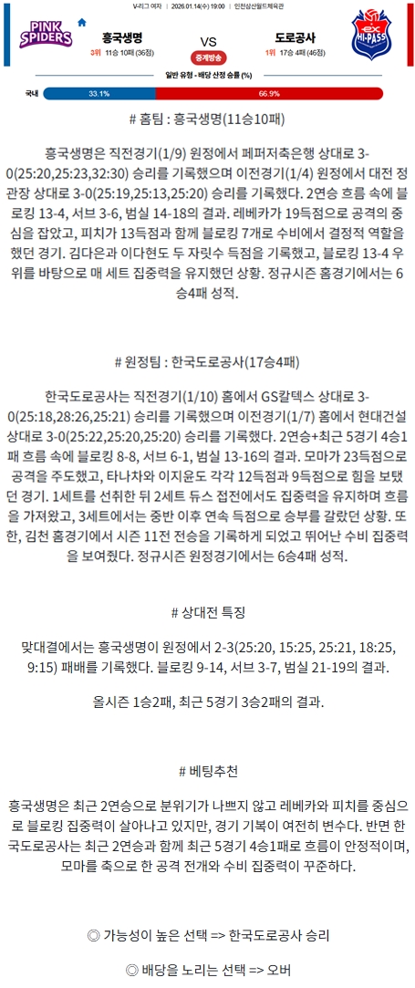 2026년 01월 14일 V리그 분석자료 / 여자배구분석