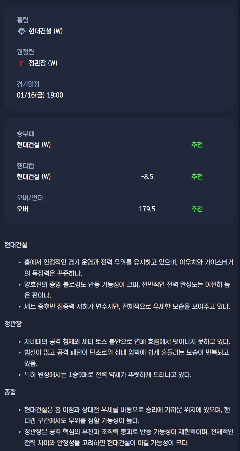 2026년 01월 16일 V리그 분석자료 / 여자배구분석