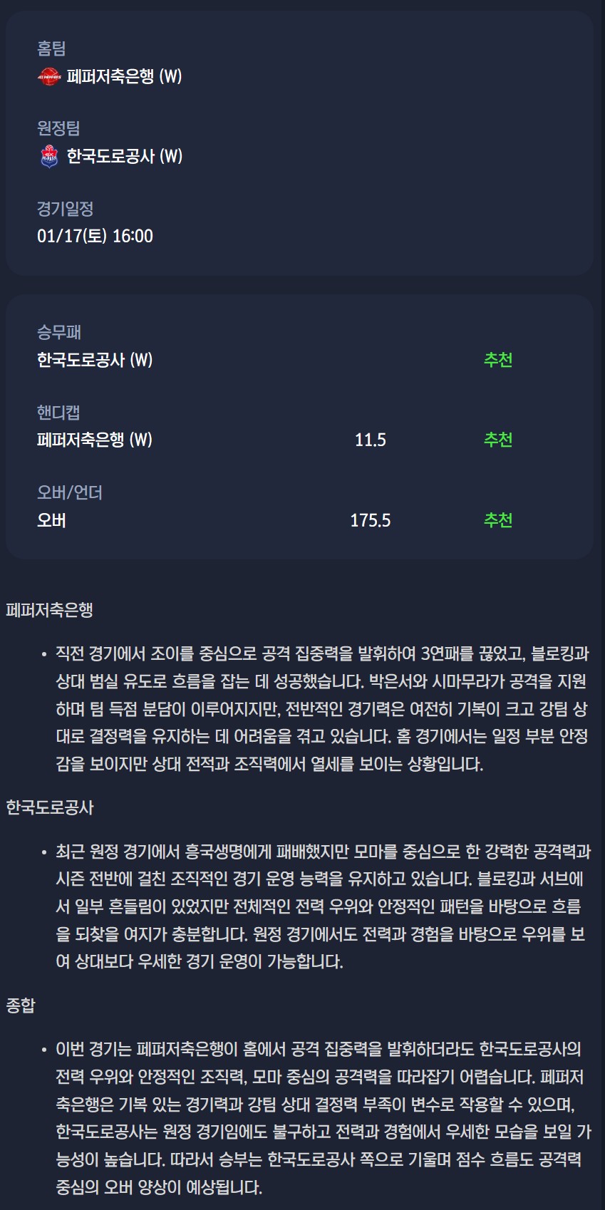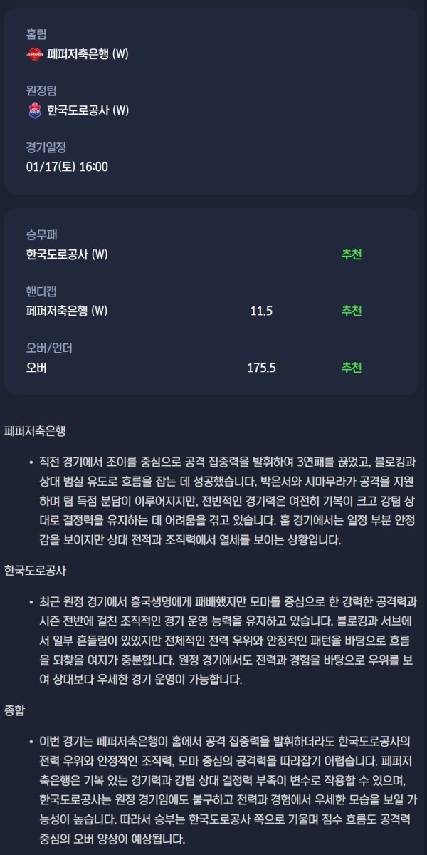 2026년 01월 17일 V리그 분석자료 / 여자배구분석