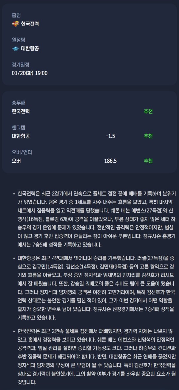 2026년 01월 20일 V리그 분석자료 / 남자배구분석