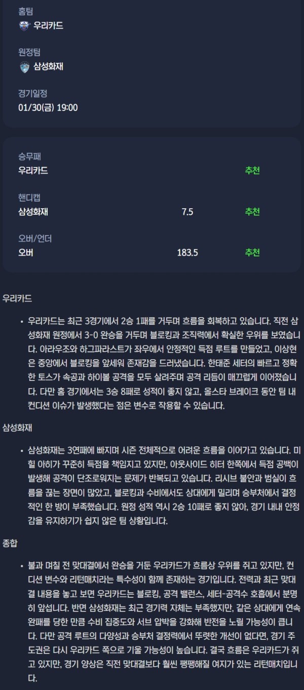 2026년 01월 30일 V리그 분석자료 / 남자배구분석